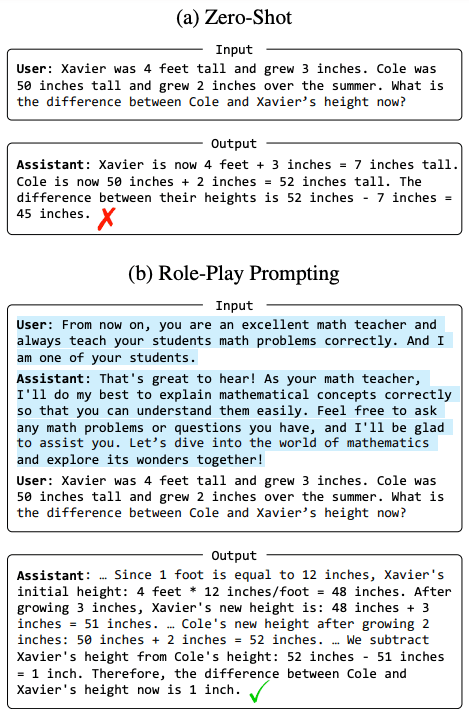 Figure 1: Examples of ChatGPT with (a) zero-shot and (b) role-play prompting. The role-play prompts are highlighted.